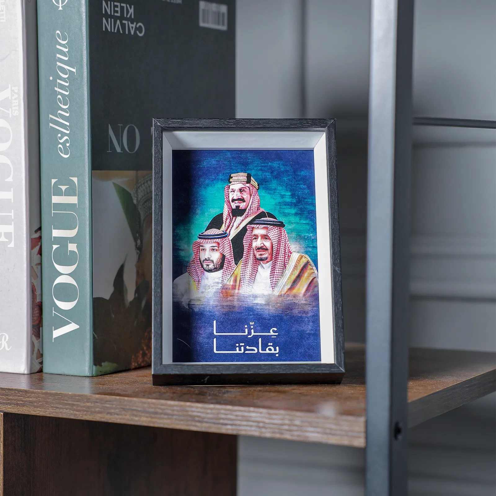 يظهر في البرواز صورة قادة السعودية: الملك عبد العزيز آل سعود، الملك سلمان بن عبد العزيز، ولي العهد الأمير محمد بن سلمان بتفاصيل فنية تعكس روح القيادة والرؤية. كما يضم عبارة (عزنا بقادتنا) للتأكيد على الاعتزاز والفخر.
